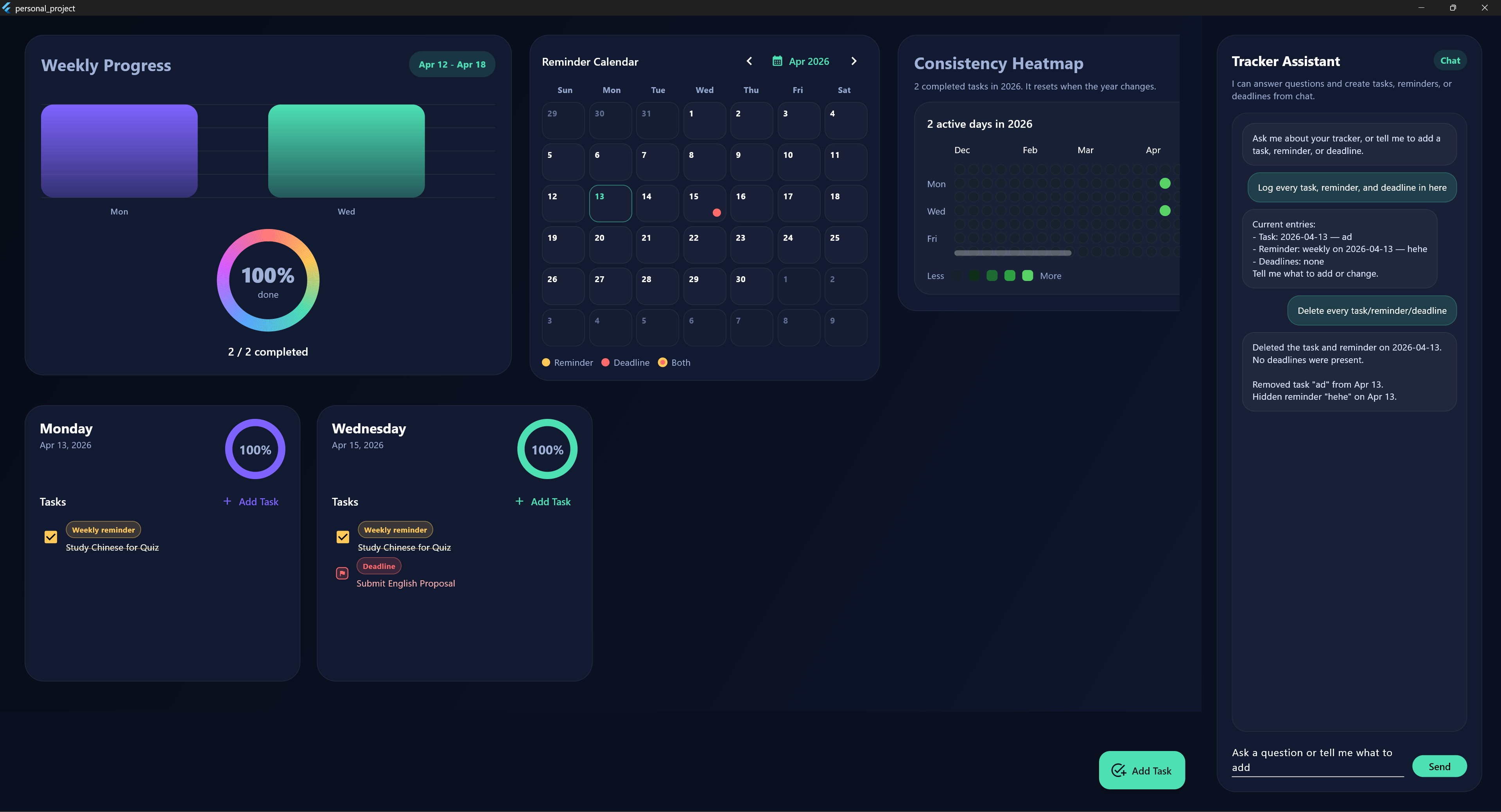 The app combines a daily task dashboard with a calendar view, progress tracking, and an optional AI assistant. You can add normal one-time tasks, set up repeating reminders for weekly, monthly, or yearly events, and create deadlines that appear as they get close. This makes it useful for both short-term daily planning and longer-term organization.